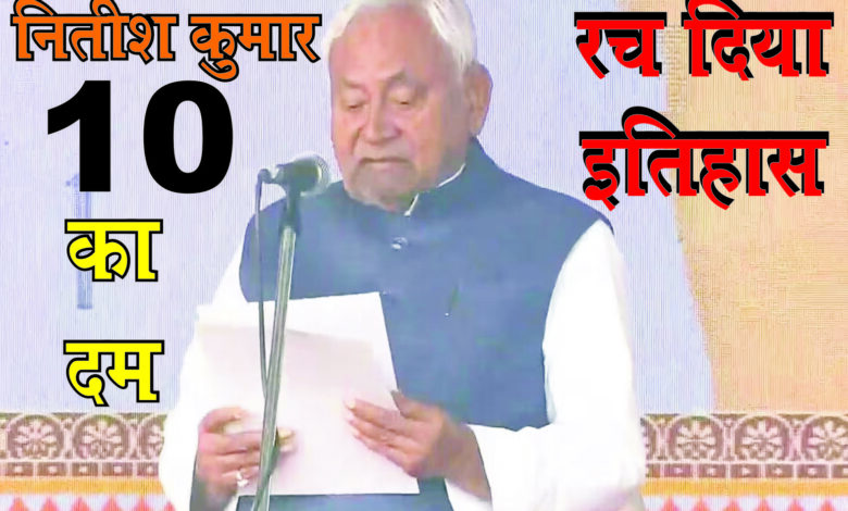 मनोहर समाचार, पटना। एनडीए गठबंधन के नेता चुने जाने के बाद नीतीश कुमार ने 10वीं बार बिहार के मुख्यमंत्री बनकर इतिहास रच दिया। पटना के गांधी मैदान में आयोजित समारोह में बिहार के राज्यपाल आरिफ मोहम्मद खान ने मुख्यमंत्री नीतीश कुमार को पद और गोपनीयता की शपथ दिलाई। इस कार्यक्रम में प्रधानमंत्री नरेंद्र मोदी और केंद्रीय गृह मंत्री अमित शाह के अलावा एनडीए शासित राज्यों के मुख्यमंत्री भी उपस्थित रहे।