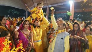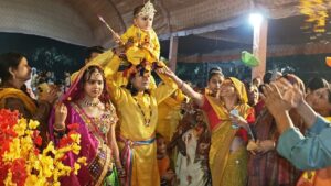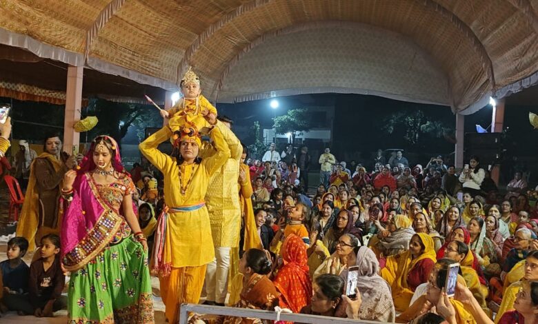 मनोहर समाचार, आगरा। हर तरफ श्रीहरि के जयघोष से गुंजायमान कथा पंडाल में भक्ति की गंगा बह रही थी। भगवान के जन्म पर लुटाए गए, उपहारों को प्रसाद स्वरूप पाने की लालसा और गोप गोपी के स्वरूप में सज धज कर पहुंचे झूमते नाचते भक्तजन मानों अयोध्या और गोकुल में उत्सव मना रहे हों। श्रीकृष्ण व श्रीराम के प्राकट्योत्सव की कथा के मौके पर पंडाल को आज गुब्बारों व सतरंगी पुष्पों से सजाया गया। बधाईयां गाई गई और शंखनाद के साथ उपहार बंटे। बाल रूप में कन्हैया के दर्शन को हर भक्त ललायित था।