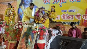 श्रीमद्भागवत कथा में श्रीराम व श्रीकृष्ण प्राकट्योत्सव की कथा में हुई उपहरों की वर्षा, राधा रानी संग श्रीहरि और सियाराम के जयकारों से गूंजा कथा पंडाल