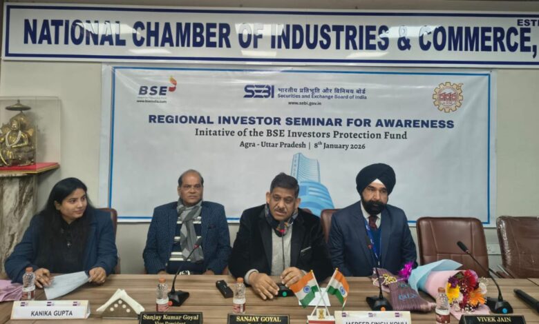 मनोहर समाचार, आगरा। चैम्बर अध्यक्ष संजय गोयल की अध्यक्षता में भारतीय प्रतिभूति और विनिमय बोर्ड बॉम्बे स्टॉक एक्सचेंज ऑफ इंडिया लिमिटेड की ओर से क्षेत्रीय निवेशक जागरूकता सेमीनार का आयोजन किया गया है जिसमें निवेश एवं वित्तीय योजनाओं आदि अनेक विषयों पर चर्चा की गयी।