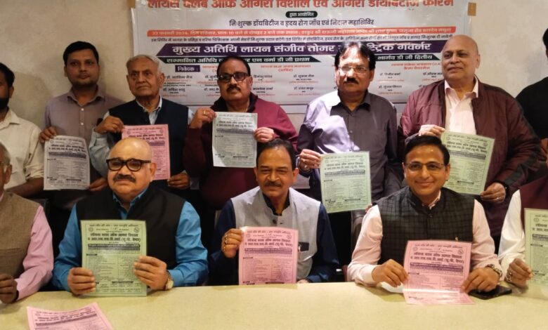 संजय प्लेस स्थित डॉक्टर्स शोप बिल्डिंग में जन जागरूकता के लिए निशुल्क स्वास्थ्य शिविर के आयोजकों द्वारा शिविर का पोस्टर जारी किया गया। क्लब के अध्यक्ष लायन सुनील गुप्ता, कोषाध्यक्ष लायन प्रमोद अग्रवाल और कैंप चेयरमैन लायन सीए राकेश अग्रवाल ने अधिक से अधिक लोगों से शिविर का लाभ लेने की अपील की।
