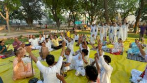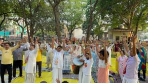 मनोहर समाचार,आगरा। जयपुर हाउस स्थित अहिंसा पार्क में आज सुबह 6 बजे से ही मृदंग और मंजीरों की भक्तिमय धुन गूंज रही थी। श्रीहरि की भक्ति में झूमते गाते भक्तों ने हरे राम-हरे कृष्णा… संकीर्तन प्रारम्भ किया तो पार्क में योग करने व टहलने पहुंचे लोग भी भक्ति भाव के साथ विश्व की खुशहाली के लिए आयोजित श्रीहरि के इस संकीर्तन में शामिल हो गए। विश्व शांति के लिए प्रार्थना की।